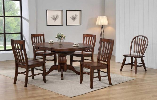 This oak veneer pedestal table and chairs feature a dark walnut finish.Read More