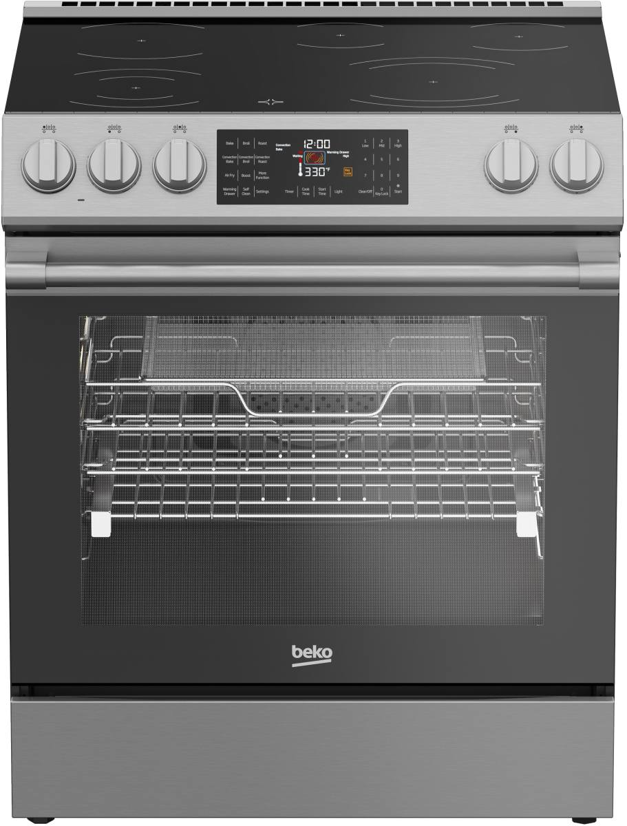 Complete your home kitchen system with the Beko 30" Stainless Steel Slide In Electric Range featuring electronic controls with multi-color LED display, metal knob controls, and control key lock function.Read More
