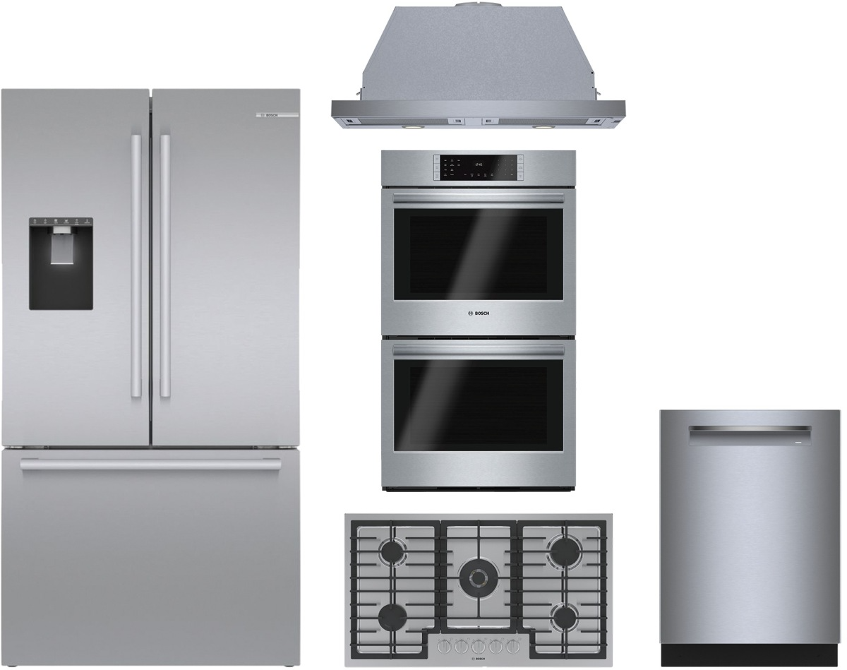 Bosch 5 Piece Stainless Steel Kitchen Package with French door refrigerator, built in dishwasher, double electric wall oven, gas cooktop and under cabinet range hood.Read More