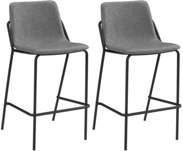 This pair of two stools offer a minimal look and a contemporary vibe. Supported by thin and tall frame in a black finish, it has an open and airy design that works with many styles. Each chair has a bucket style, Mid Century inspired seat, which is wrapped in a leatherette that is easy to clean and soft to the touch. In addition, each stool offers a supportive footrest run between the two front legs. Add a pair of these stools to a home bar for entertaining.