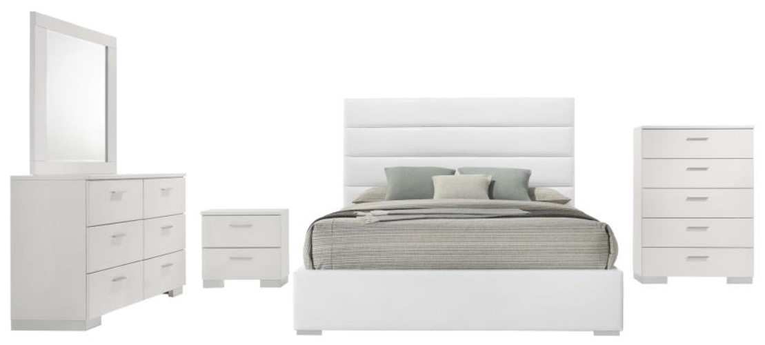 Includes: One (1) California king bed, one (1) nightstand, one (1) dresser, one (1) dresser mirror, and one (1) chest of drawers