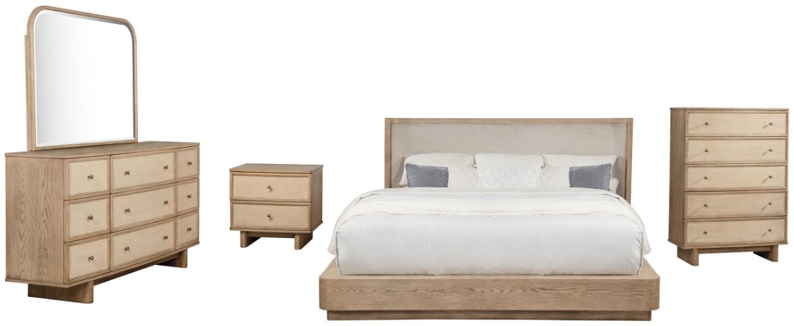 Includes: One (1) California king bed, one (1) nightstand, one (1) dresser, one (1) dresser mirror, and one (1) chest