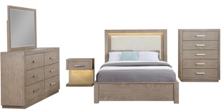 Includes: One (1) california king bed, one (1) nightstand, one (1) dresser, one (1) dresser mirror, and one (1) chest