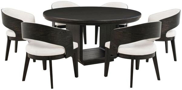 Gather in grounded elegance with this dining set, where sculptural form and graceful texture meet. A bold round pedestal table anchors the space in a burnished black finish, its open base and soft curves inviting conversation and connection.Read More