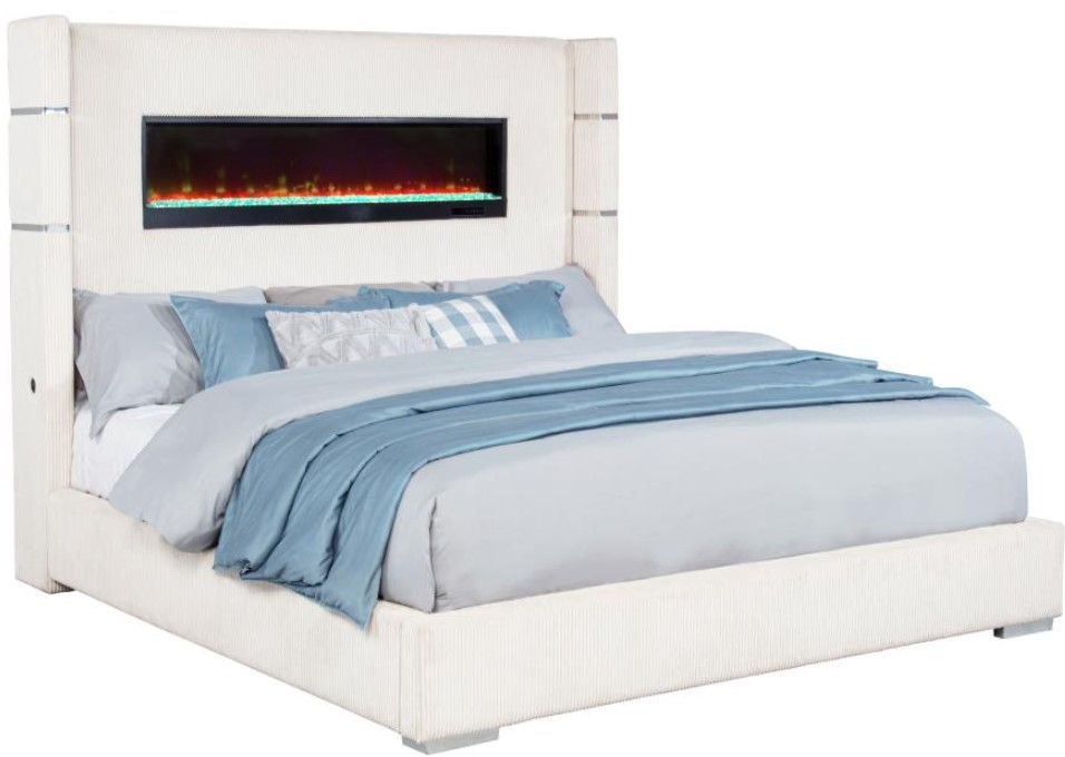 Eastern king size upholstered wingback panel bed with integrated flame box