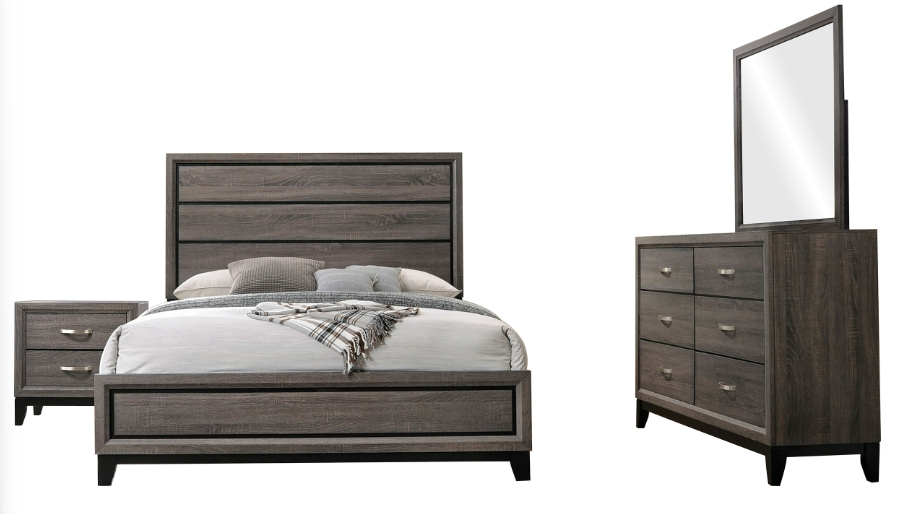 Four piece eastern king bedroom set in Grey Oak and Black pairs bed and storage