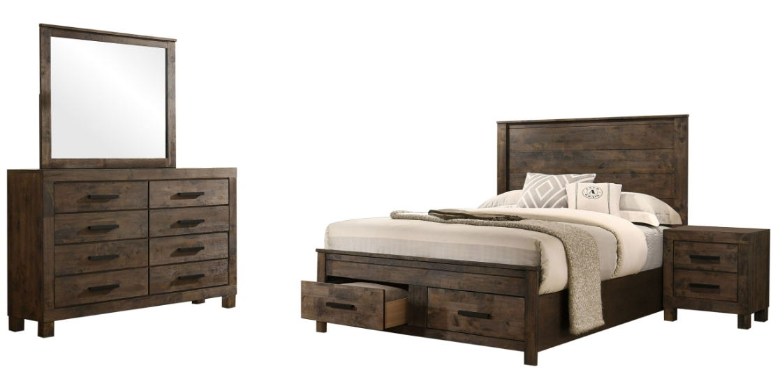 Bring warmth and character to your bedroom with the Woodmont set, crafted with a rustic golden brown matte finish and wire-brushed wood grain details. Solid block legs and sturdy construction ensure durability, while wooden bar handles add rugged charm.Read More