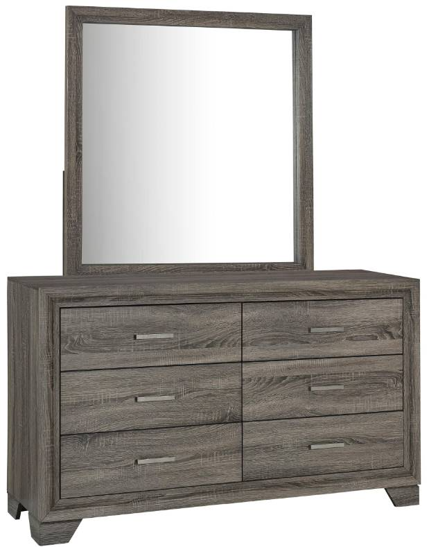 Complete your bedroom storage ensemble with the roomy space in this transitional six-drawer dresser with a framed mirror that attaches directly to the back of the dresser. It boasts a brown oak wood grain finish over laminate surfaces, creating a stylish look that resists everyday wear and tear.Read More