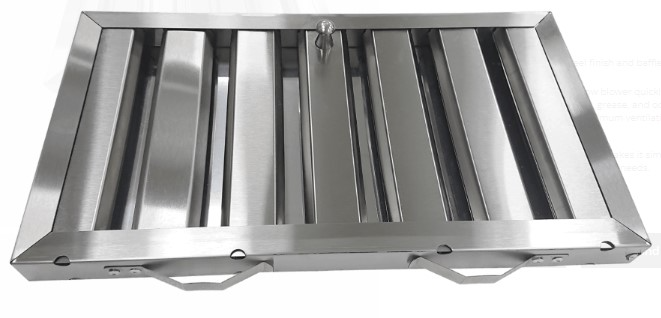 The baffle filter's combination of panels and curved plates a larger surface area that causes oils in the hot air to condensate on the steel. Dishwasher safe design allows for easy cleaning.
