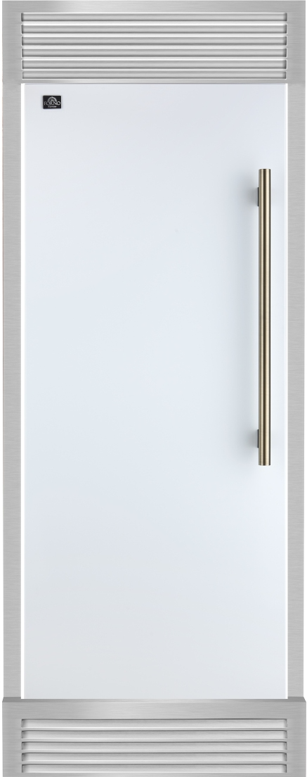 The Forno Maderno 28-inch refrigerator offers a built-in look with a decorative grill to upgrade it to 32-inch width for seamless kitchen integration. Available in white and featuring antique brass handles, it’s part of our elegant Espresso line. With 13.6 cu.ft. of capacity and a convertible cooling zone, it delivers flexible storage and functionality. Total no-frost technology eliminates manual defrosting, while the metal multi-airflow system maintains consistent freshness. Inside, 3 glass shelves and 3 drawers with silver trims maximize organization. The swing door design and intuitive electronic touch control panel enhance everyday convenience. VCM doors, a metal back panel, and energy star certification ensure durability and efficiency.Read More