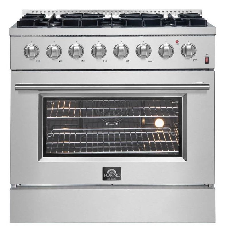 The Forno Marco 36” Dual Fuel Range delivers pro-level styling and performance with its sleek stainless-steel design. The 67,000 BTU range top, featuring 6 sealed burners, offers everything from gentle simmers to powerful sears. Continuous cast iron grates ensure smooth pan transitions. The spacious 5.36 cu.ft. true convection oven features a 1500W convection element and fan for precise, even cooking, while the dual-element broil ensures perfect browning. Its black enamel interior and halogen lights enhance visibility and make cleaning easy. With a hidden bake burner to prevent spills and odors, this range is built for convenience. It comes equipped with a NEMA 14-50P power cord and a 1/2" gas regulator for easy installation. Compatible with natural gas and propane (conversion kit included), this range combines durability, sophistication, and cooking flexibility. Lower the cost of living with Forno.Read More