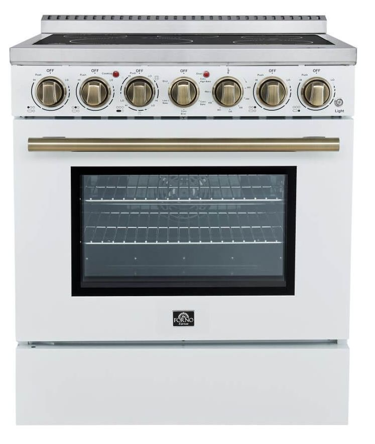 The Forno Paolo 30" Freestanding Electric Range in white, the ultimate kitchen upgrade. This stunning range merges style and top-tier performance with an elegant white finish, complemented by a stainless steel surround on the ceramic glass cooktop. This design ensures even heat distribution across its 5 radiant elements with a total output of 7,800 watts. The oven features a powerful 1,200-watt true convection system, combined with a total bake and broil output of 3,800 watts, delivering faster, more even cooking results. The hidden bake element simplifies maintenance by preventing spills from burning onto the element, reducing odors, and making cleanup effortless. The bright halogen interior oven lighting and large viewing window allow you to monitor your cooking progress without opening the door and losing heat. Additionally, the range includes a 100-watt warming zone to keep dishes at the ideal serving temperature, and a dual-element broiler for precise, high-heat cooking. Elevate your kitchen with this timeless, user-friendly range that combines durability with sophisticated design. Cook with confidence and embrace efficiency and style with every use.Read More