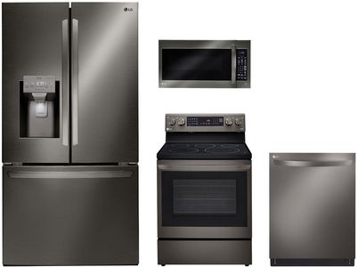 LG 4 Piece Black Stainless Steel Kitchen Package with a french door refrigerator, free standing electric range, over the range microwave, and a built in dishwasher.Read More