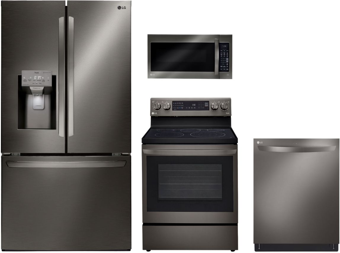 LG 4 Piece Black Stainless Steel Kitchen Package with french door refrigerator, free standing electric range, built in dishwasher and over the range microwaveRead More
