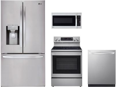 LG 4 Piece Stainless Steel Kitchen Package with a french door refrigerator, free standing electric range, over the range microwave, and a built in dishwasher.Read More
