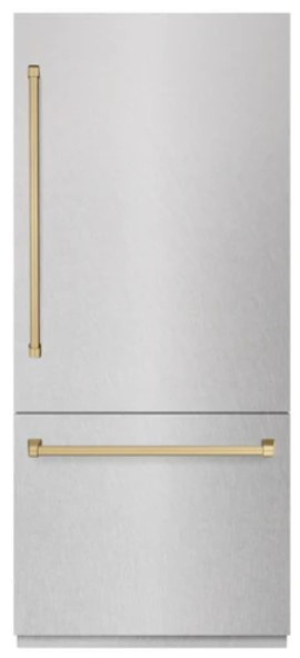 Luxury isn’t meant to be desired - it’s meant to be attainable. The ZLINE Autograph Edition 36 in. 19.8 cu. ft. Built-In Bottom Freezer Refrigerator with Water Dispenser and Ice Maker in Satin Stainless Steel with Graphite Gray Interior and Champagne Bronze Accents (GRBITZ-SN-36-CB)Read More