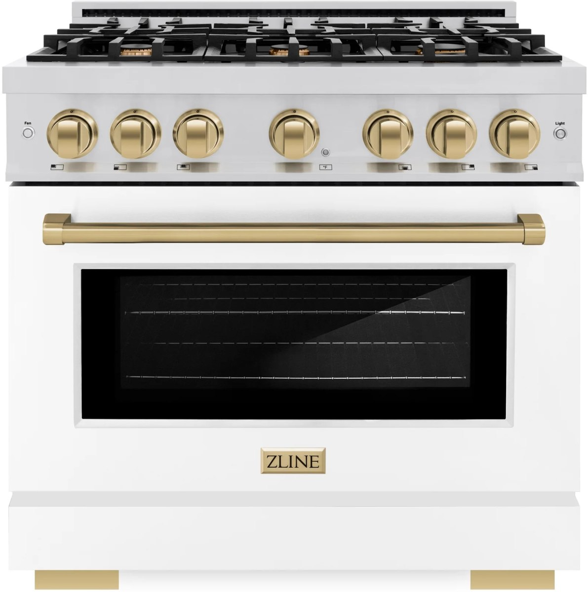 The ZLINE Autograph Edition 36 in. 5.2 cu. ft. Select Dual Fuel Range with 6 Burner Gas Cooktop and Electric Convection Oven in Stainless Steel with White Matte Door and Champagne Bronze Accents (HDRZ-WM-36-CB) combines the elegance of a hand-finished porcelain gas cooktop with 6 Italian-made auto-reignition burners, an electric convection oven with an energy-efficient cooling fan to ensure quiet operation, a beautiful white matte door with a Horizon window design, and stunning champagne bronze knobs and handle allowing you to master every meal.