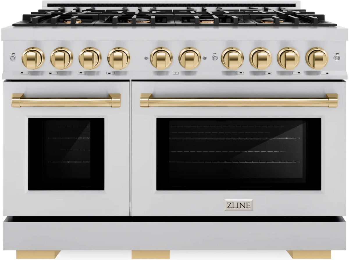 The ZLINE Autograph Edition 48 in. 6.7 cu. ft. Select Double Oven Gas Range with 8 Burner Cooktop in Stainless Steel and Polished Gold Accents (HGRZ-48-G) combines the elegance of a hand-finished porcelain gas cooktop with 8 Italian-made auto-reignition burners, a large gas convection oven with an energy-efficient cooling fan to ensure quiet operation, a small baking oven, Horizon oven door window designs, and stunning polished gold knobs and handles allowing you to master every meal.
